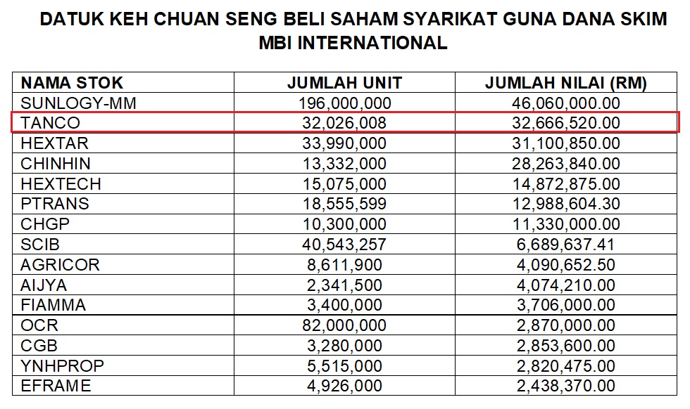 Antara syarikat yang paling menonjol ialah Tanco Holdings Bhd, di mana Dato’ Sri Andrew Tan Jun Suan, Pengarah Urusan Kumpulan menjadi sasaran. Beliau didakwa menerima suntikan dana yang asalnya datang daripada skim MBI bagi menyokong operasi dan memperkukuh kedudukan Tanco di Bursa. Sejumlah lebih 32 juta saham dengan nilai RM46 juta. Dana-dana haram ini pasti akan dijejak. Andrew Tan Jun Suan pasti bakal terheret sama.