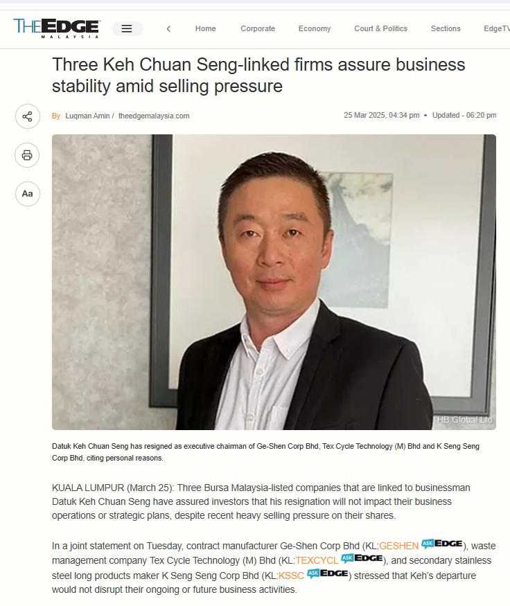Namun pada 24 Mac 2025, Datuk Keh mengejutkan pasaran dengan melepaskan kesemua jawatannya dalam syarikat-syarikat ini secara serentak atas alasan “keadaan peribadi yang tidak dijangka.” Frazel Group Sdn Bhd (Milik Datuk Keh) dan dan Enrich Signature Sdn Bhd (Milik Chin Hin) sering bersama dalam menguasai saham syarikat senarai awam. Kesemua pegangan saham kemudiannya kini dilaporkan berpindah kepada Chin Hin Group melalui syarikat Enrich Signature Sdn Bhd.