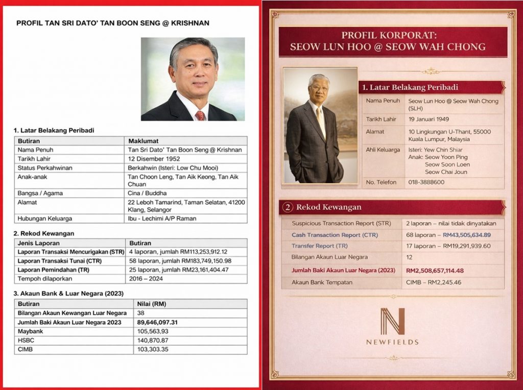 Sebelum ini dilaporkan Tan Sri Krishnan Tan memiliki 38 akaun diluar negara dengan nilai wang RM90 juta dan Seow Lun Hoo @ Seow Wah Chong 12 akaun di luar negara dengan wang RM2.5bilion.